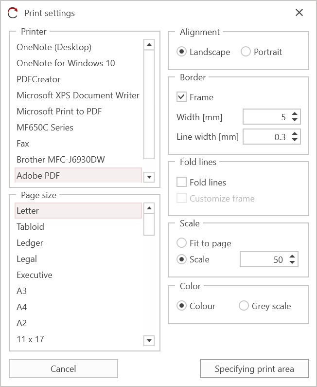 Scaling: Allows you to define whether the plan should be adapted to the paper format or printed at a specific scale. If you select scale, you can specify it. (Option only available when printing plan documents)